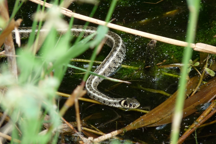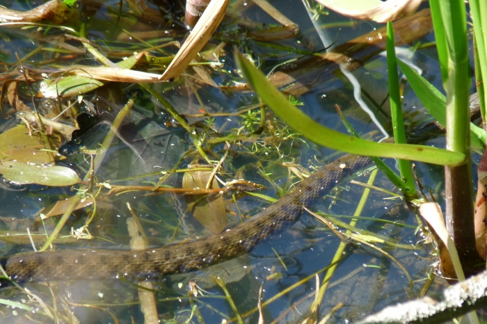 Vízisikló, hátán két világos csíkkal.