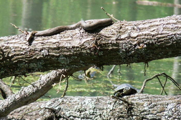 Napozó kockás sikló és mocsári teknős.