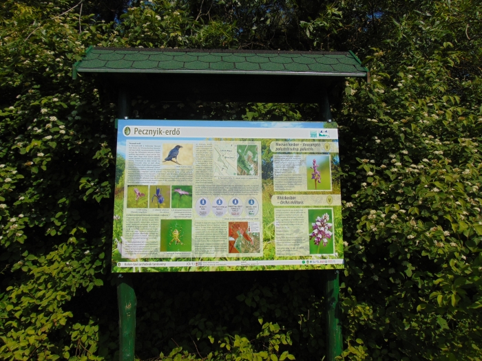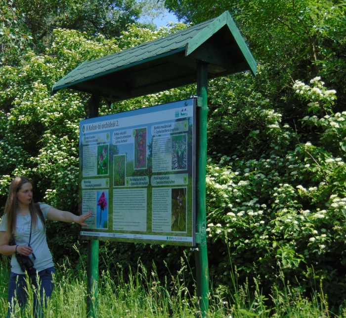 Az orchidea tanösvény kezdő táblájánál megálltunk, s Edina nagy szaktudással és még nagyobb szeretettel ismertette a terület legfőbb jellemzőit. Az orchideák bemutatásán kívül az is elhangzott, hogy mit jelent, hogy egy láp „ex lege” (a törvény erejénél fogva) védett. Ennek értelmében minden láp, külön eljárás nélkül védett, bármikor fedezik is fel, illetve bárhol van az ország területén.