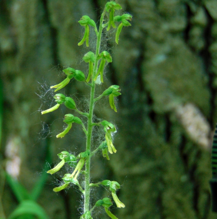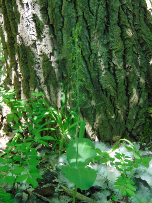 Utunk során még rábukkantunk a pókbangó egy példányára, amely különleges, bársonyos színű mézajkával igen egzotikus látvány. (Részletesebben lásd korábbi cikkemben: Titokzatos szépségek…) Ha vezetőnk, Edina nem hívja fel a figyelmünket egy újabb, de immár erdei fajra, biztosan egyikünk sem veszi észre. Ez a faj a tojásdad békakonty. Szerény, árnyéktűrő növény, amit annak ellenére nehéz észrevenni, hogy legalább fél méter magas. Virágai azonban keskenyek, sárgás színűek. Közelről szemlélve őket valóban beleláthatjuk egy ugró béka hátsó, kinyújtott lábait. (Kb. annyira hasonlít, mint a cseppkövek szoktak hasonlítani a fantázianevükre.) Ezt a fajt még sosem láttam, ezért is nagy öröm volt megismerkedni vele!