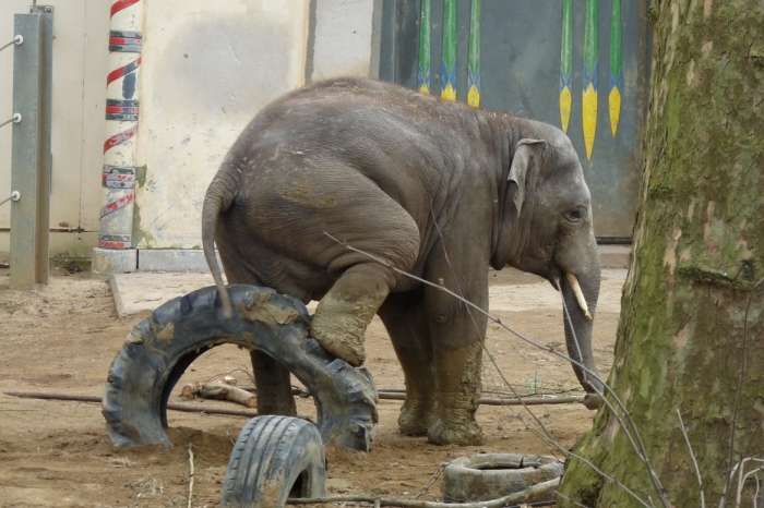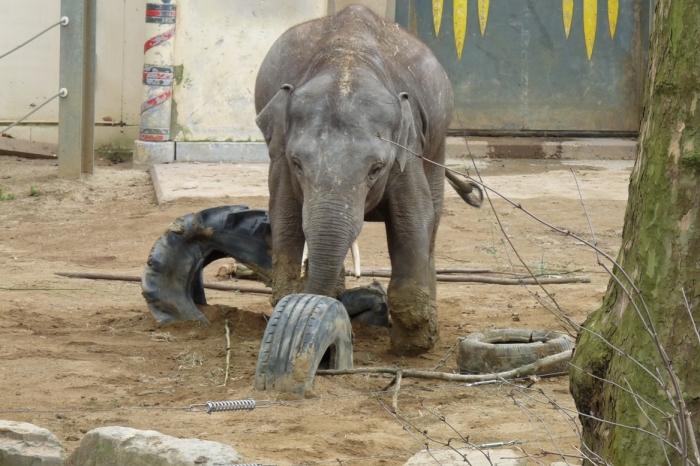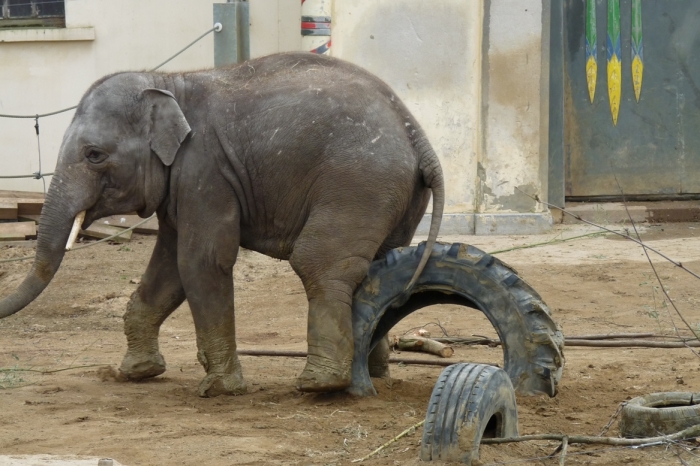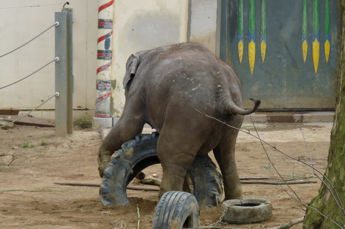 Amíg figyeltem a kiselefántokat, az ingergazdag kifutóban minden játékszerrel kreatívan játszottak. Főleg az tetszett nekem, ahogy egyikük egy nagy autógumival szórakozott. Minden irányból hajlítgatta, ráült, rálépett, fejével lenyomta a földig, ráfeküdt! Mint egy igazi kisgyerek!