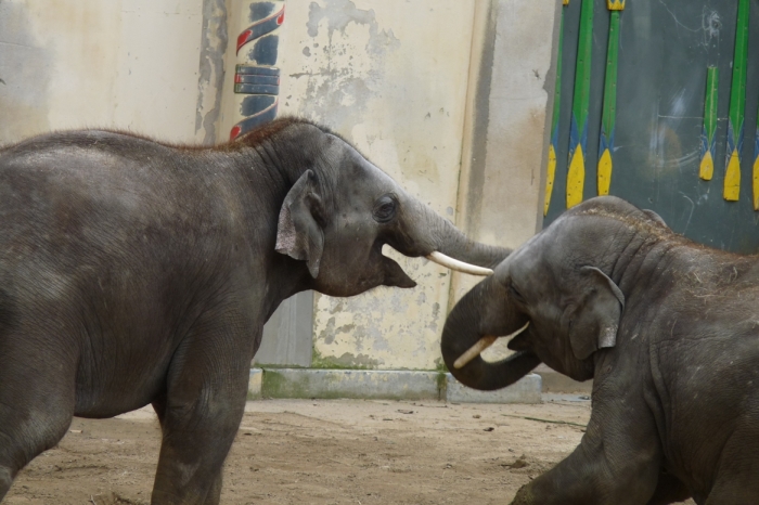 Amikor elunták a játékszereket és a dagonyát is, egymással kergetőztek a kifutóban. Még döfködték is egymást az agyarukkal, de a látszólag durva döfések nyomai meg sem látszottak a vastag bőrön. Egyikük se vette zokon a másiktól a játék ilyen erőteljes voltát, folyton keresték egymás társaságát. Időnként a két kemény fejecske egymásnak feszült és erőből igyekeztek elnyomni egymást. Ha éppen nem az erejüket próbálgatták, akkor az ormányukat fűzték össze és gyengéden bántak egymással.