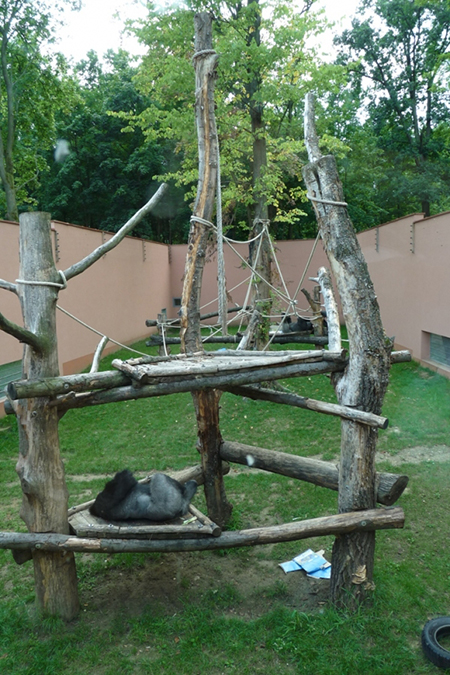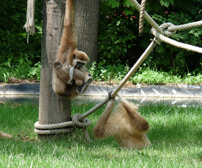 Nekem nagyon tetszenek azok a tágas kifutók, melyekben az állatok szabadon mozoghatnak, s elég ingergazdag környezetben élhetnek. Ilyen a gibbonok új szigete. Itt még rácsokra sincs szükség, elég a vizesárok. Idén a kis család egy kölyökkel szaporodott. Sokáig néztük, amint a kölyök próbálgatta az ügyességét a kifeszített köteleken, az anyja mellett. Aztán a közelben pihenő apját kezdte piszkálni, mindig újra belecsimpaszkodva annak lelógó lábaiba. Az apa egyszerre csak felkapta a kölyköt a hátsó lábaival és belemélyesztette a hatalmas szemfogait….… látszólag. Mert amint letette a kölyköt a „rendreutasítás” után, az azonnal felpattant és újra a lábába csimpaszkodott. Addig, amíg a papa újra felkapta, ismét tátott szájjal megcsiklandozta a pocakját és letette. Ez körülbelül így zajlott egymás után vagy hússzor. Mintha a saját gyerekeinket látnánk! Szinte hallani véltük a kölyök kacagását. Micsoda kiváló móka a nagy és erős papával incselkedni!