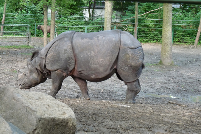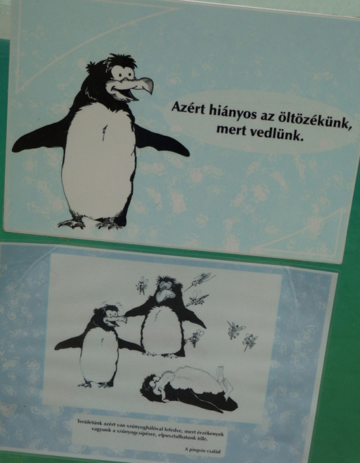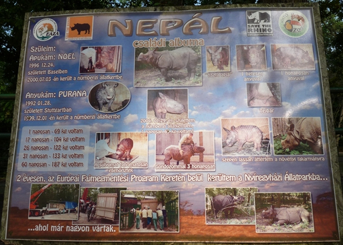Más indiai állat is él a kertben: Nepál, az indiai orrszarvú. Nagyon tetszett nekem az a tábla, ami bemutatja nekünk ennek a példánynak a történetét. Olyan, mint egy igazi családi album képekkel és feliratokkal. Megtudhatjuk, kik a szülei, s hogy 2004-ben született Nürnbergben (lásd:fotó). Más érdekes táblát is láttam, pl. a pingvineknél azt, amelyről megtudhatjuk, hogy éppen vedlenek, s a háló a szúnyogoktól védi őket, melyekre érzékenyek.