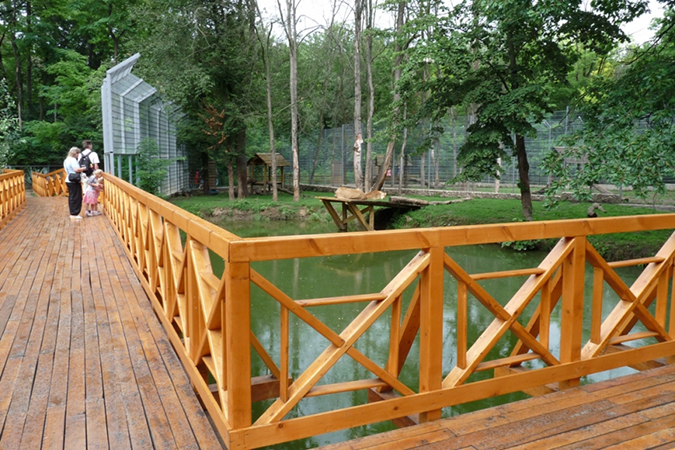 Még oroszlánokat is lehet rács nélkül figyelni! Ez a bravúros megoldás egy tavacska fölötti hídrendszer, ahonnan belátunk az oroszlánkifutóba. Itt is született kölyök, aki sajnos egyke, s nincs játszótársa. Amikor ott jártunk, az anyját gyötörte, aki elég hamar elunta ezt, s csatlakozott a többi felnőtthöz. Szegény kicsi csalódottan lehevert.