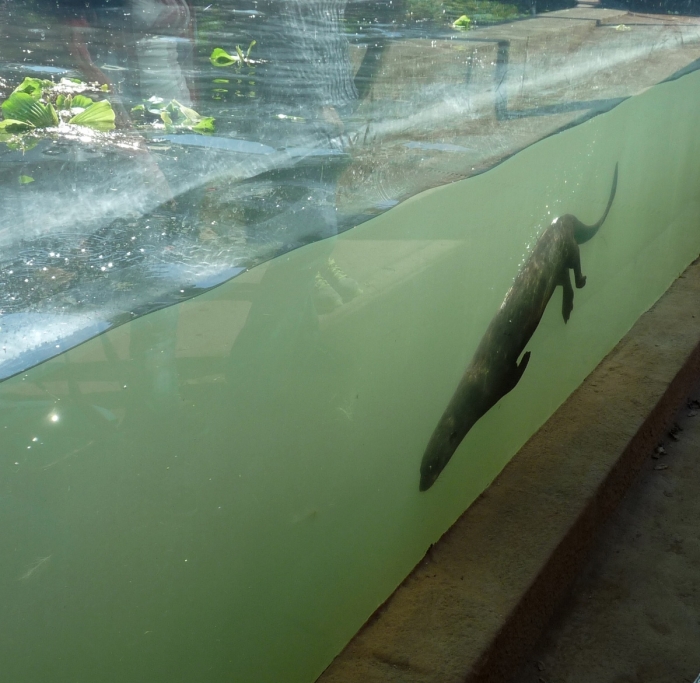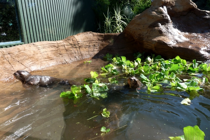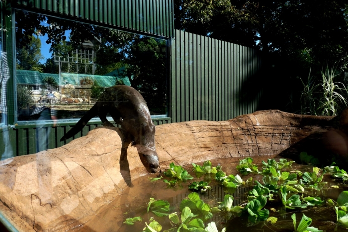 A kifutójuk a korábbi lepkekert helyén látható, kialakítása egészen új, esztétikus és részletgazdag. Van benne úszómedence, de „patak” is. A vidrák kereshetnek maguknak búvóhelyet a fatörzsek alatt, szaladgálhatnak a füvön vagy áshatnak a földes részeken. Mivel azt olvastam róluk, hogy a napozóhelyeiken ki szokták irtani a növényzetet, lehet, hogy veszélyben vannak a kifutó szép fái és bokrai? Majd meglátjuk.